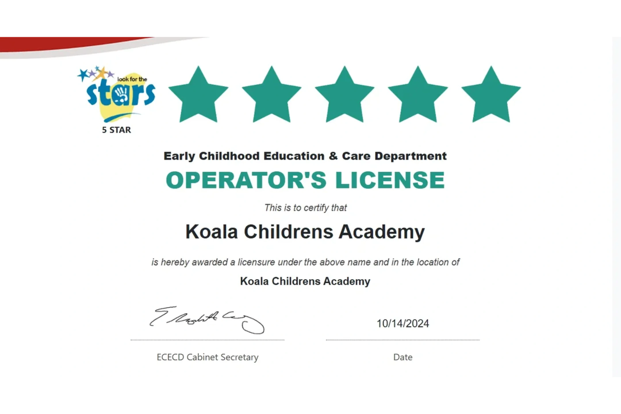 Since the opening of KCA in October 2023 we have been working very hard to meet the qualifications of a 5-STAR center. In just under a year, we were surveyed and are pleased to announce we have received a 5-STAR rating! We could have not done this without the hard work from our Educators and Administration!